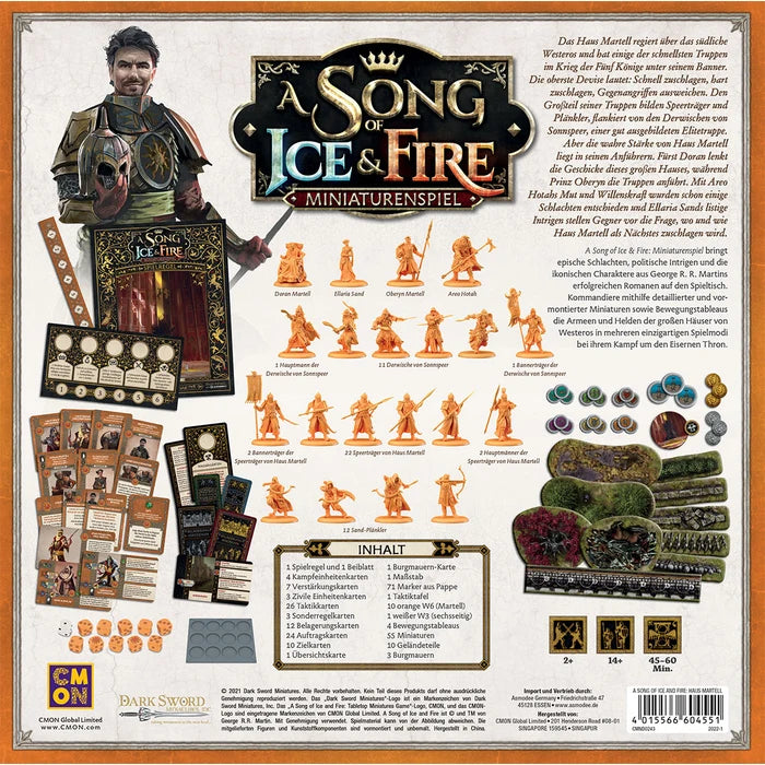 Das Martell Starterset bringt insgesamt 55 Miniaturen in die beliebte Welt des epischen Tabletop-Spiels A Song of Ice & Fire. Es bietet Spielern alles, was sie brauchen, um ihren Anspruch auf den Eisernen Thron zu erheben. Das Starterset wird komplett mit einem Regelbuch, Würfeln, Messstäben, Statistikkarten und Miniaturen geliefert, um eine vollständige Armee aufzustellen. Die Spieler erhalten Charaktere wie Oberyn Martell und Ellaria Sand sowie diverse weitere ikonische Einheiten des Hauses Martell.