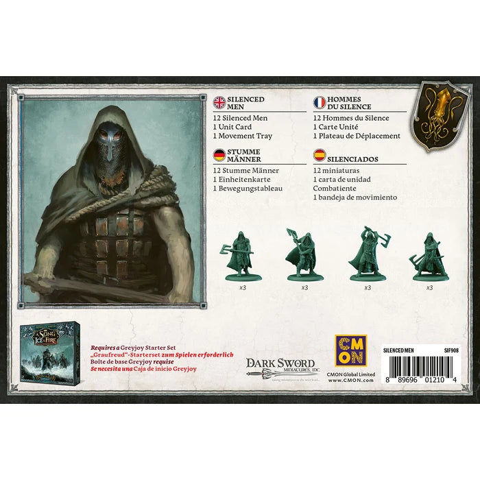 Die Einheiten-Erweiterung A Song of Ice & Fire – Silenced Men (Stumme Männer) gibt den Spielern des Hauses Graufreud eine neue, unheimliche Einheit für ihre Armee. Die Stummen Männern pirschen sich an das Schlachtfeld heran und schwingen ihre Großäxte mit Leichtigkeit. Wie alle Einheiten des Hauses Graufreud sind sie geschickt darin, gefallene Feinde zu erbeuten und erhalten Plünderungsplättchen, wenn eine feindliche Reihe gefällt wird. Die Stille, die mit der Einheit einhergeht, erschüttert Feinde bis ins Mark und veranlasst sie dazu, Panikproben zu machen, sobald sie aktiviert werden. Diese Proben sind schwieriger zu bestehen und verheerender bei einem Fehlschlag, für jeden Plündermarker, den die Stummen Männer gesammelt haben.